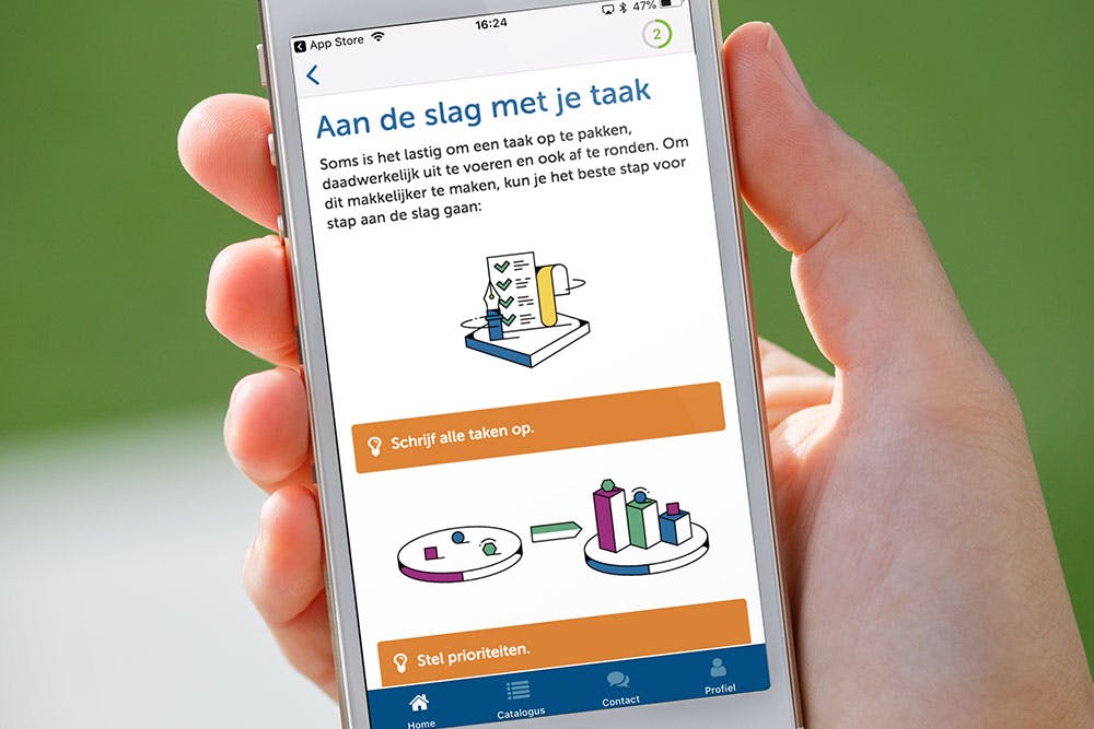 De module bestaat uit 1 hoofdstuk, 1 mijlpaal en 1 verzendmoment. Dit maakt de module ideaal om naast of in combinatie met andere modules in te zetten, maar ‘Hoe krijg je meer structuur in je dagen?’ kan ook los worden aangeboden. De module kan ingezet worden vanuit onder andere de POH-GGZ, de generalistische basis GGZ of de specialistische GGZ, waarbij een hulpverlener wel of geen feedback geeft. Als je ervoor kiest om de module onbegeleid in te zetten, worden de verzendmomenten automatisch reflectiemomenten. Door online met bepaalde onderwerpen aan de slag te gaan, is er in de face-to-face sessies meer ruimte voor diepgang.