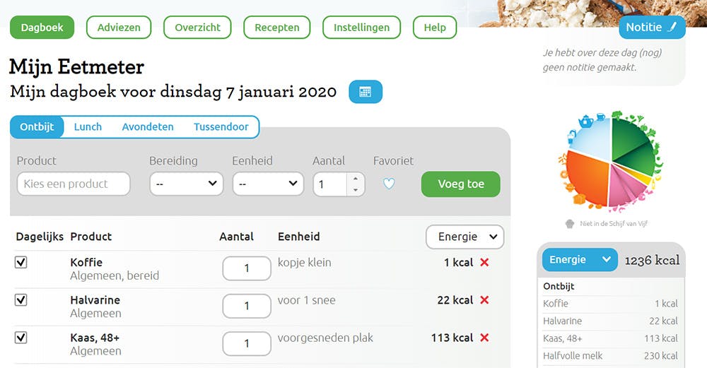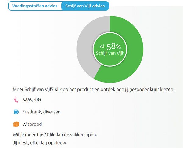 In de app kun je door het invullen van het eetdagboek zien hoeveel voedingsstoffen en calorieën je binnenkrijgt en kun je bekijken in hoeverre je eet volgens de Schijf van Vijf. Mensen die graag meer volgens de Schijf van Vijf willen eten, bieden we een Schijf van Vijf-advies aan. Daarin krijg je te zien hoeveel jij al eet volgens de Schijf van Vijf en krijg je tips hoe je gezonder kunt kiezen. Tot slot is het mogelijk om je gewicht bij te houden met een ingebouwde BMI-meter.