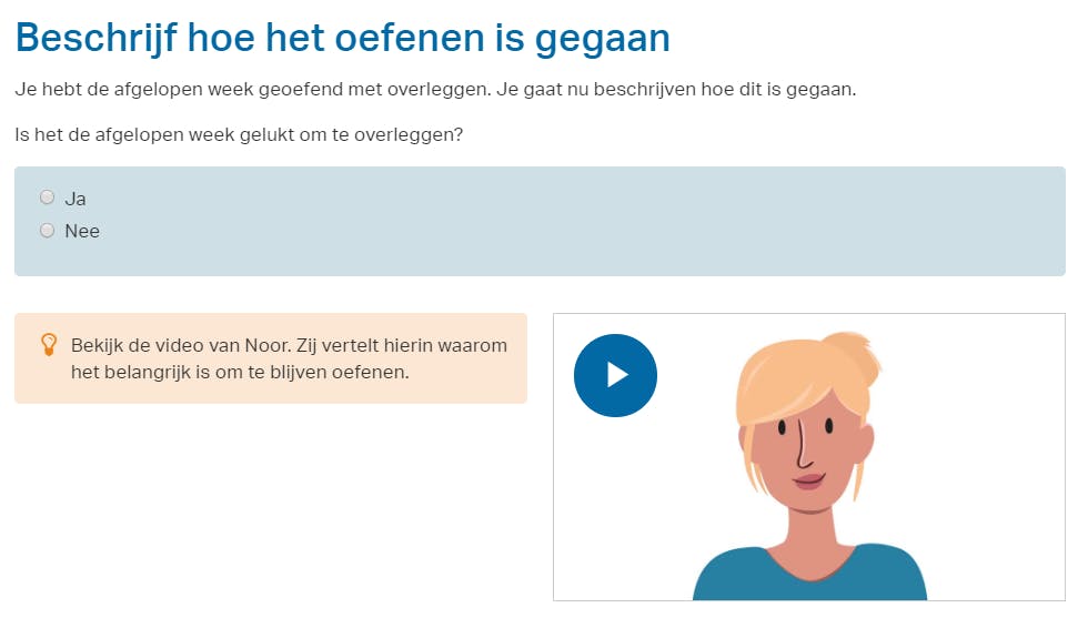 In iedere sessie krijgt de cliënt informatie, bekijkt filmpjes van de online hulpverlener en een cliënt, leest de oefeningen van voorbeeldcliënten en gaat zelf aan de slag met één of meerdere oefeningen.